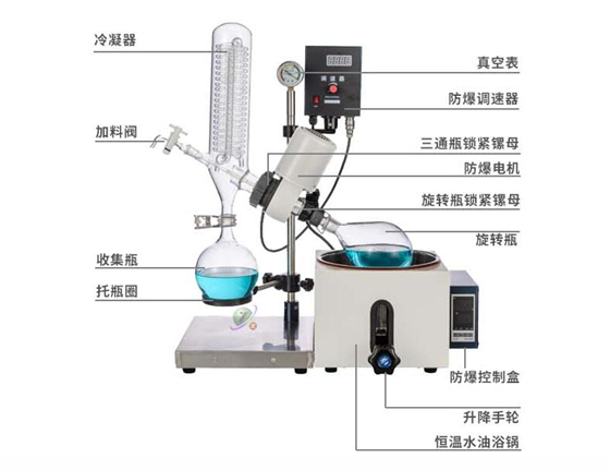 旋轉蒸發器還可能包括其他輔助部件,如升降手柄、控制面板、加料閥等,以確保設備的穩定運行和操作的便捷性。這些部件共同協作,使旋轉蒸發器成為一種高效、可靠的蒸發設備,廣泛應用于化學、化工、生物醫藥等領域。