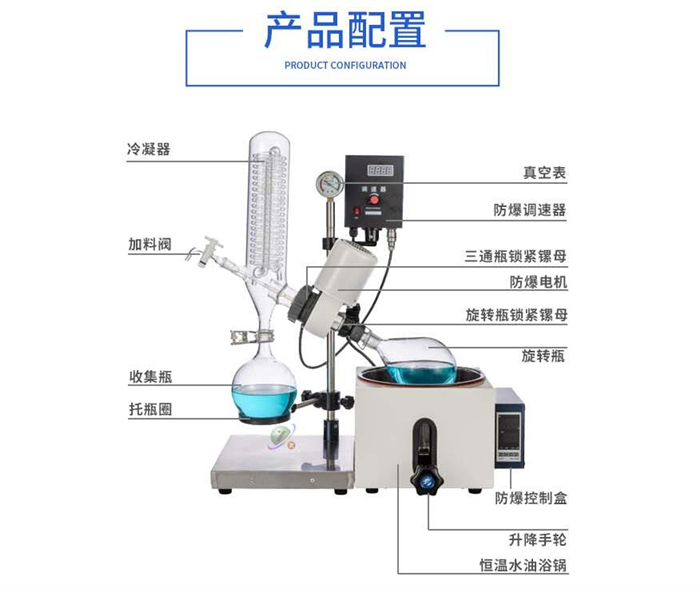 旋轉(zhuǎn)蒸發(fā)器還可能包括其他輔助部件,如升降手柄、控制面板、加料閥等,以確保設(shè)備的穩(wěn)定運行和操作的便捷性。這些部件共同協(xié)作,使旋轉(zhuǎn)蒸發(fā)器成為一種高效、可靠的蒸發(fā)設(shè)備,廣泛應(yīng)用于化學(xué)、化工、生物醫(yī)藥等領(lǐng)域。